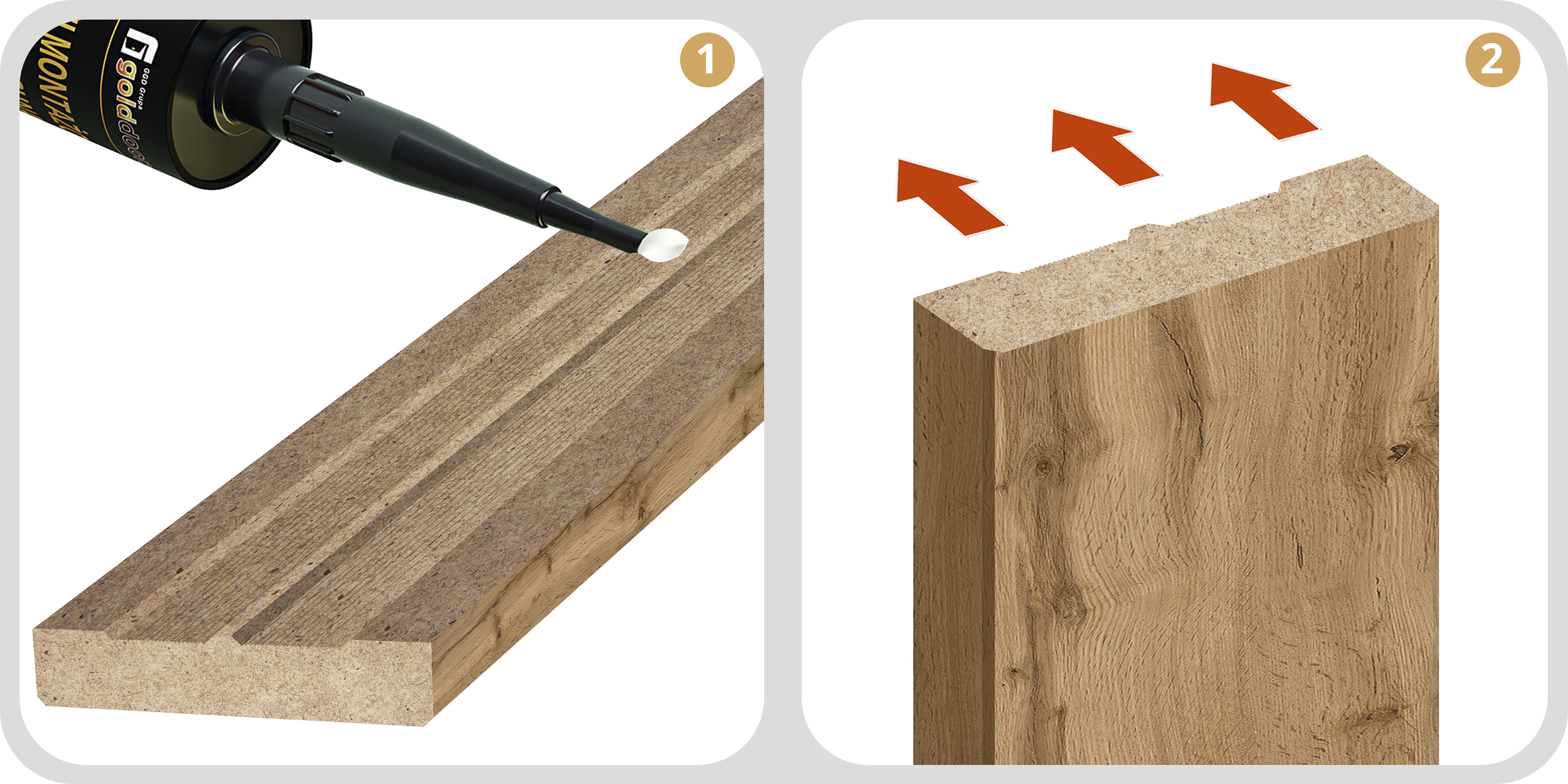 1. Naneste lepidlo v oblasti frézovania (zadná strana lamely).