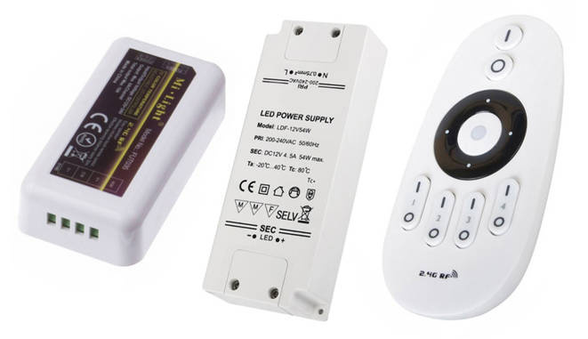 - Jeden ovládač riadi osvetlenie s celkovou maximálnou intenzitou 10 A. Vyznačuje sa nízkou spotrebou energie, veľkým dosahom a vysokou odolnosťou proti rušeniu. Vyžaduje pripojenie k zdroju napájania.