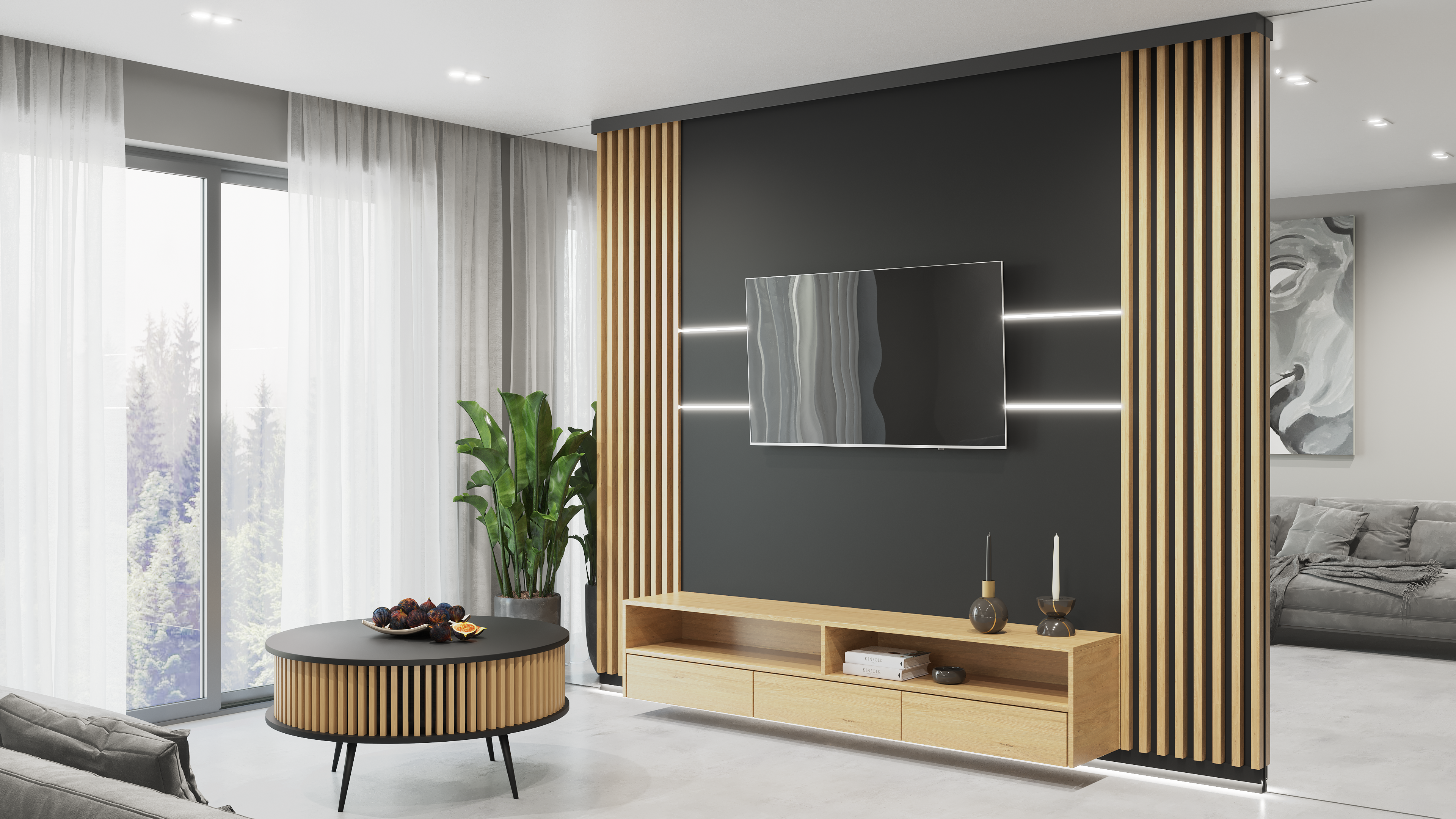 Jedným z prvkov ponúkanej kompozície je 8 cm vysoký sokel s LED osvetlením, ktorý celú kompozíciu vystavuje a upozorňuje na ňu a dodáva miestnosti teplo.
